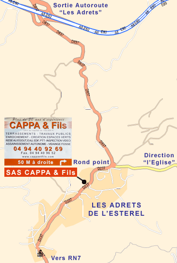 Nous sommes situés au village "Les Adrets de l'Esterel" en limite des deux départements (Var 83 et Alpes Maritimes 06), à 2,5 km du péage de l'autoroute A8 qui traverse toute la Côte d'Azur.